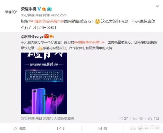 5月21日荣耀总裁赵明发布微博庆祝荣耀10销量突破100万大关,自4月27日首销,到5月21日共历时24日,是荣耀历史上,突破百万销量用时最短的手机,这个数据在业界也是非常惊人的,可以见得荣耀10的受欢迎程度是非常高的。