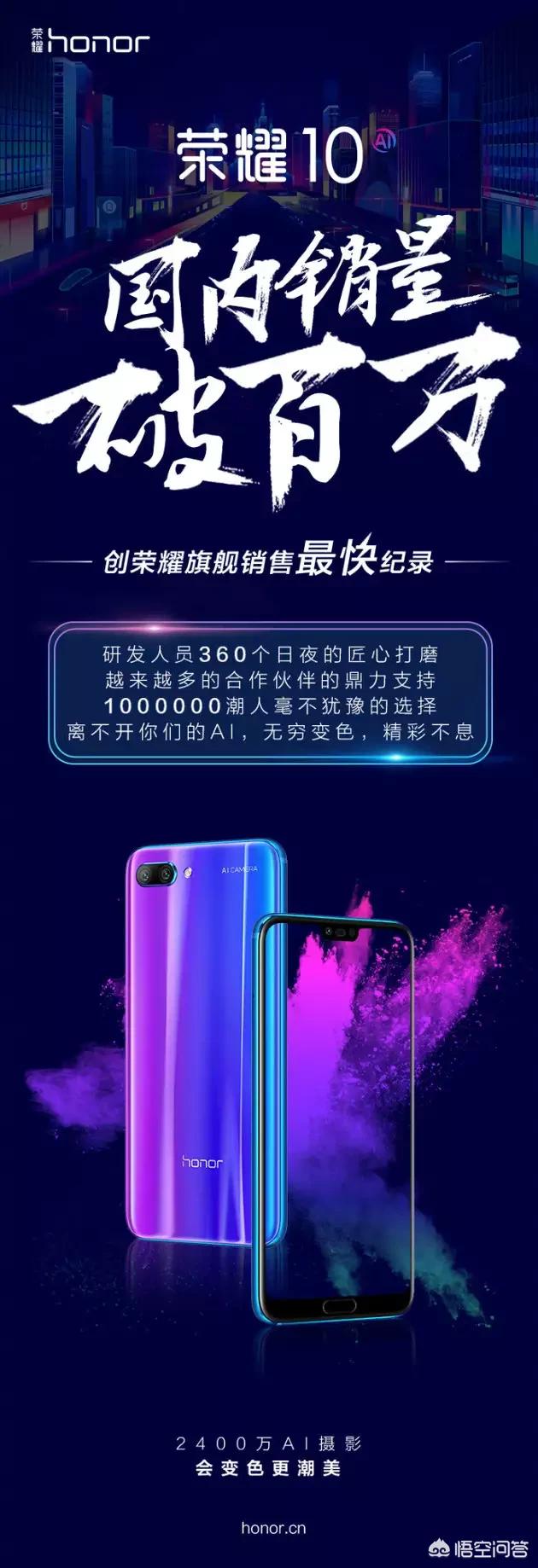 荣耀10搭载麒麟970处理器,全系6g内存,配置强劲,2599起步的价格性价比十足,无穷变色背板,更加潮美,拍照方面,加入了AI摄影模式,实力大增,综合方面也算是非常优秀的,所以有这个销量也是在情理之中了。