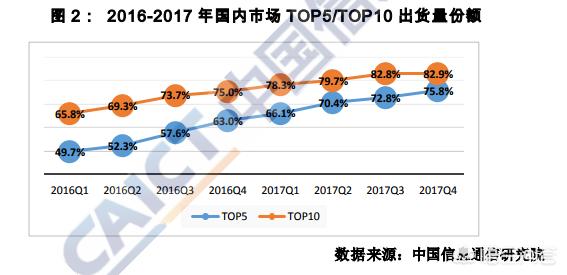 而中小企业面临严峻的竞争压力,处于第二梯队(6-10位)的厂商,份额受明显挤压,2016年TOP6至TOP 10厂商出货量合计份额14.2%,2017年下降至9.3%。