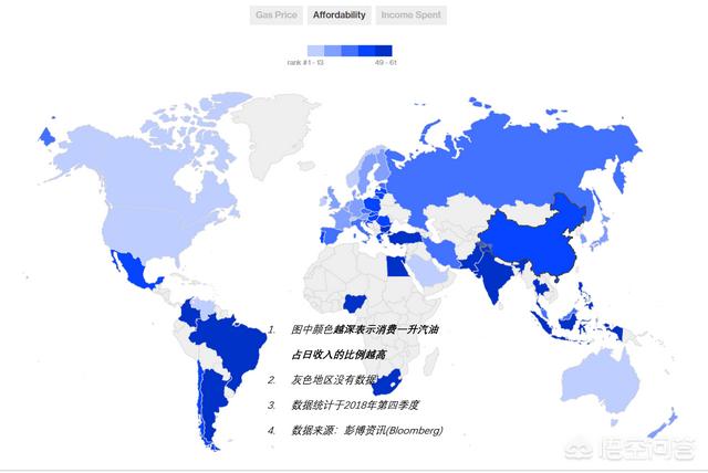根据彭博资讯统计2018年第四季度中国居民的平均日收入在173.69元/天,消费一升汽油占到日均收入的4.13%。这个比例在世界范围内是什么水平呢?这么说吧全球有统计数据的国家只有十个国家比中国高,排名第一的是印度,其比例高达18.51%。这些比中国高的国家属于欠发达地区。
