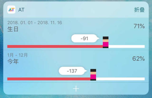 在 AT 中设置纪念日或目标的截止时间,就能在通知中心看到事件进度条与期限。人物图标的设计很有创意。