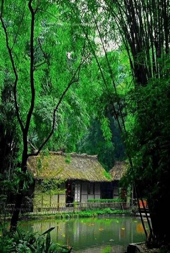 下联:茅舍绿树围。