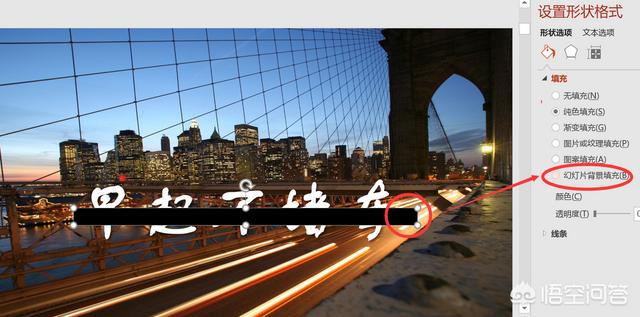 第三步,我们选中矩形色块,设置形状格式,选择色块的填充方式为“幻灯片背景填充”