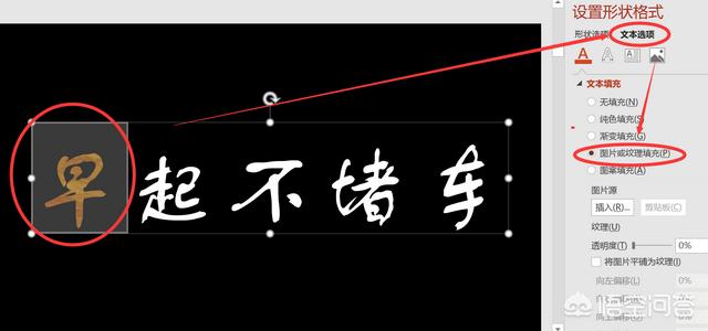 第二步,选中“早”字,设置形状格式、文本选项、图片或纹理填充。