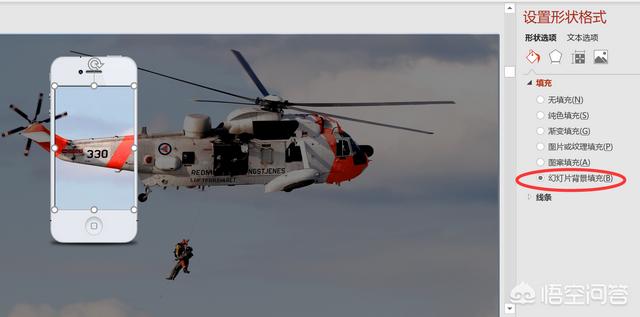 第三步、插入一个手机图片,手机屏幕位置插入一个矩形框,在矩形框上右键,设置形状格式,在形状填充中选择“幻灯片背景填充”即可。