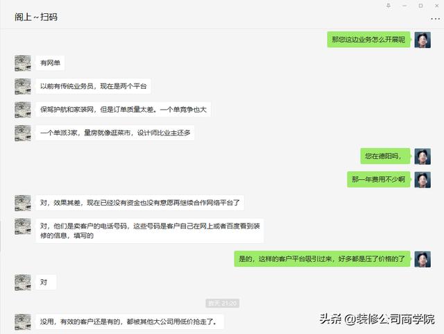 传统的装饰公司业务手段比较单一,主要有线下的地推,做活动,电销,老客户介绍,另外就是公交广告,小区广告这些,线上的有一些有资金的会选择和网络派单平台合作。
