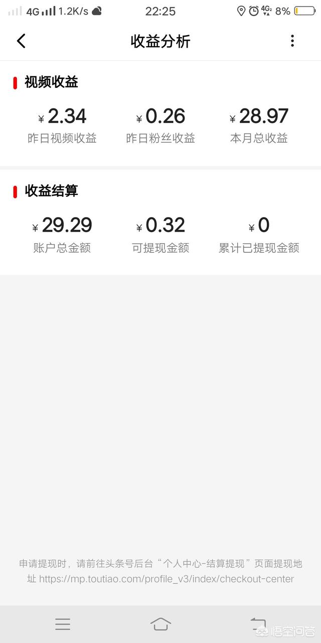 我账号开通总共是一个月,目前粉丝(加上死鱼)总共只有33位,视频总发布数8个,视频播放量为4586,总收入为0.92,虽然收入才那么一丁点,两根棒棒糖都买不着,不过我只是把这个当一个爱好,没投入什么精力。