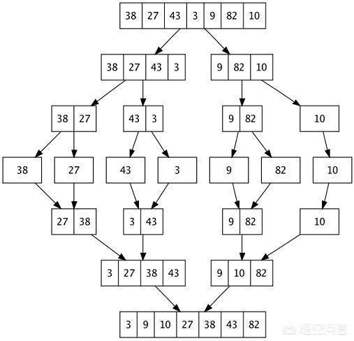 由于数组被分成许多的单个数据,比较起来就简单了,然后开始合并,合并的同时排序。