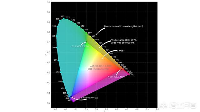 上图框出的就是sRGB色域所显示的所有颜色,sRGB是由微软和惠普在1996年制定的,可以说是最早的色域标准之一。