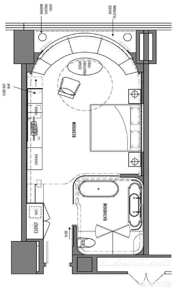 一个酒店的标准客房就相当于我们的卧室,所以我们单从卧室来对比分析。酒店的客房要求在仅有的使用面积内,满足标准客房的所有功能,其中包括有卫生间(马桶、淋浴或浴缸、盥洗)、储物柜(衣柜、行李架、、鞋架、保险柜)、电视柜、床、床头柜、写字台、休闲沙发等。在这么小的面积空间里面要想正常的摆放是很困难的。所以很多功能都进行了简化。这样的简化并不适合住宅空间使用。比如衣柜,衣柜在住宅空间内的位置非常重要,所以衣柜不能参考酒店做法的,因为酒店的做法无法满足住宅空间的储物需求。还有就是写字台,住宅空间的卧室个人不建议放写字台。