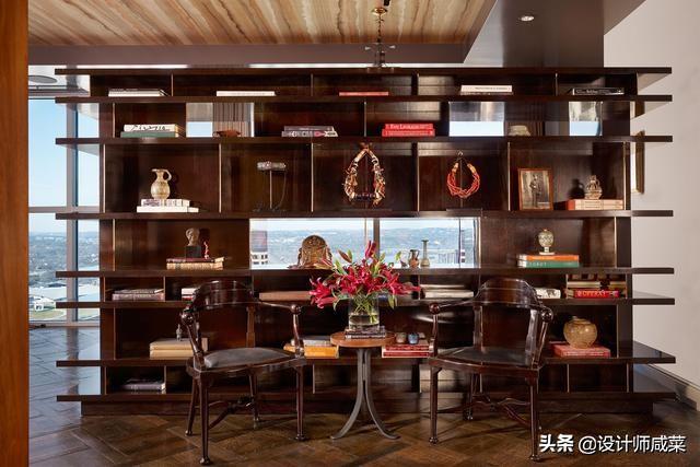 书架兼收纳展示隔断,进门就吸人眼球,客人拜访一进门不会一下子找不到话题聊。