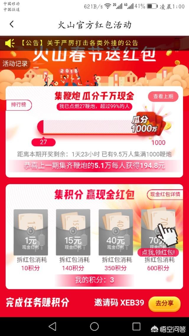 3.其他火力就是平常你做火山的任务,最近有火山春节红包活动。