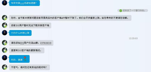 而最近一次的iOS版本1.4.0更新说明是在 2017-01-13,Appstore里搜索也找不到相关软件,为此小编联系了下迅游加速器的客服,对话如下:
