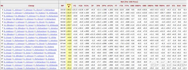这是热火本赛季派出过的5人组名单,发现有13套阵容,他们在场上都是赢对手的,说明他们靠的都是整体的防守。
