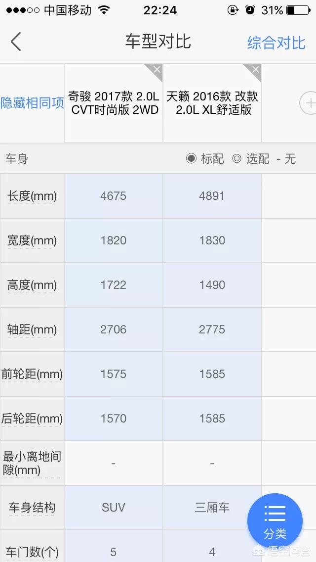 又或者说奇骏和天籁这算是同牌子同价位的,比如可能就少个电动调节之类的配置,这个没办法统一概括,只能说一个一个的分析,不过大概上,同价位的轿车应该比SUV的配置要高一些,特别是合资车和进口车。
