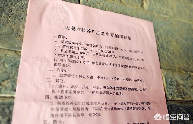 除此之外,红事要求饭菜每桌不超过260元,白酒不超过30元,烟不超过10元,宴请仅限于亲戚,并且不超过20桌;礼金不超过100元,乐队不超过20人,车辆不超过12辆,本村结亲不超过8辆。白事则规定烟花爆竹不超过5箱、不穿白、不摆席、不发烟、不请戏。