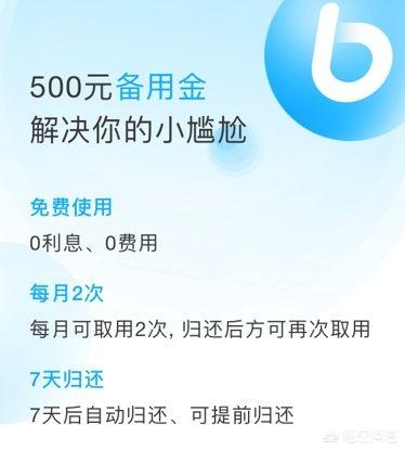 类似于支付宝的借呗功能,不过备用金并不会收取费用,期限也仅有 7 天,备用金固定额度每人为 500 元。每个月可以领取 2 次, 7 天之后自动归还,也支持提前还款,这相当于小额急救金额。