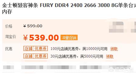 金士顿骇客神条DDR4 2400 8G 539元。