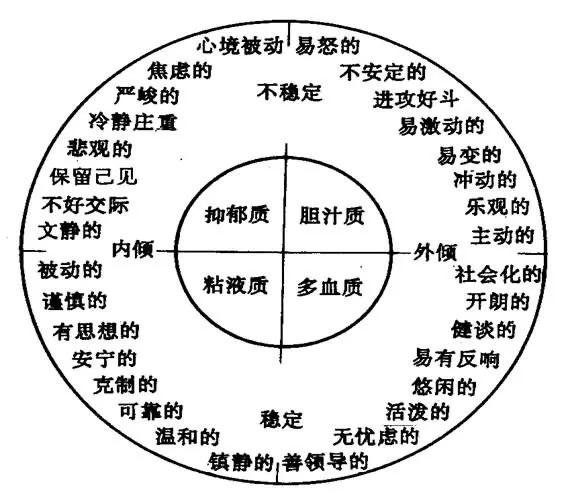 每个人都有天生的气质类型,公元前5世纪古希腊医生希波克拉特就认为,人体内有四种液体,即血液、粘液、黄胆汁、黑胆汁。这四种液体在人体内的比例不同,形成了气质的四个类型,即多血质、胆汁质、粘液质、抑郁质。