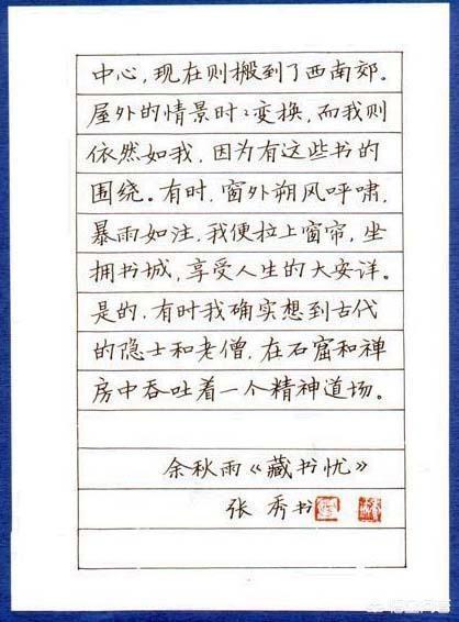 并未被遗忘,我还经常观摩下他的字,只是很少写他的字体了,他的字形宽阔,写时须拉开架势,笔划得长度到位,不然没看头,走形,所以写起来较慢,但象庞中华这样有真功夫,字体又全面,能登大雅之堂的人不多。比如二田的字,楷书不错,但行书不出色,我昨天在网上找了半天,也没找到合适的硬笔行书字帖。王羲之,文征明,赵孟頫都是行书高手,可都是毛笔字。抱庸的字真得很美,耐看,但笔划和单个字都没固定的形体,全是临场发挥,学不来,只有高手,达到一定水平才能领会到要领。目前还真找不到能跟庞中华比肩的行书字帖,很急人。