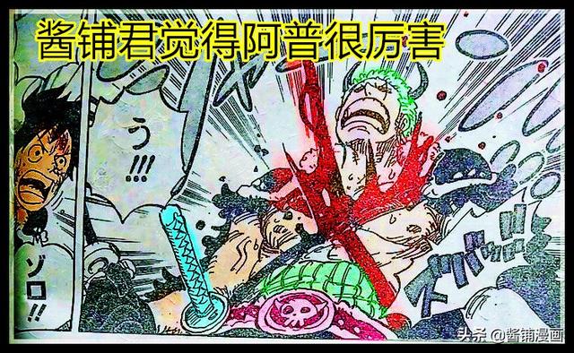 索隆提醒路飞,还有东西要飞过来,结果阿普立马念到:“斩”,很快索隆的胸口被狠狠的划伤了一刀,音波的力量具备了切割的能力,作者尾田大神的想象力非常丰富,阿普实在是太能打了。
