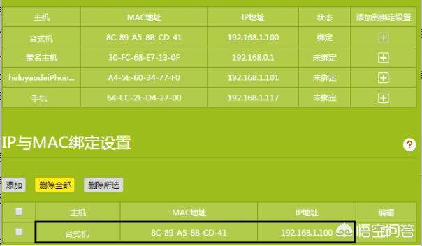 点击上图中各终端条目的 添加到绑定设置,在IP与MAC绑定设置 中会自动显示该条目,即表示绑定成功,如下图: