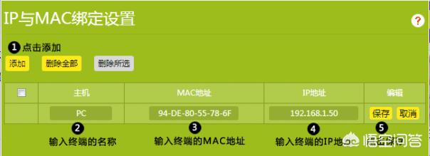 如果终端未连接路由器,需要手动添加终端的IP地址和MAC地址。在IP与MAC绑定设置界面,点击 添加,输入终端的MAC地址、IP地址,点击 保存 即可。如下图: