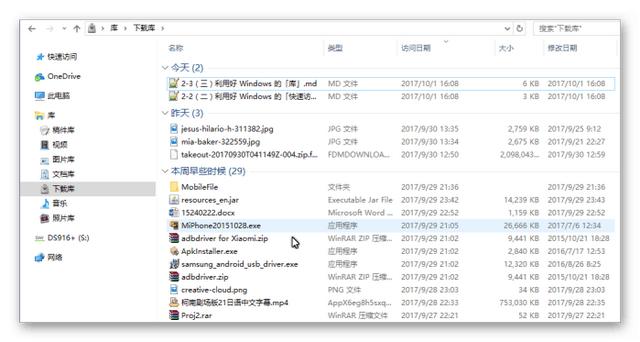 至于为什么要按照 访问日期 而不是默认的 修改日期 分组,那是因为有些文件在下载时会保留文件本身的修改日期,图中的 adbdrive for Xiaomi.zip 就是这样,修改日期是 2015 年。按修改日期排列会导致新下载的文件出现在较老的位置,而访问日期基本可以认为是 下载时间,这样排序更合理。