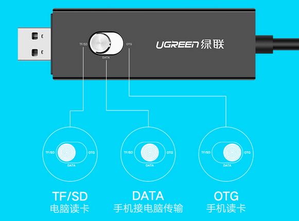 读卡器有三种读取模式,通过读卡器上的按钮实现。比如,当你通过读卡器把电脑和手机都连接的时候,按钮滑动到TF/SD卡模式,表示电脑在读取SD卡,当按钮滑动到DATA模式,表示电脑读取手机,当按钮滑到OTG模式,手机读SD卡,所以电脑读手机的时候不用另外插上数据线,读卡器一次性搞定。