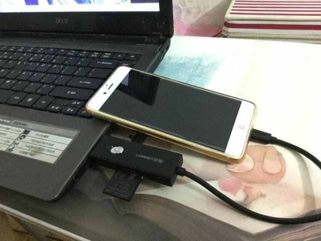 让读卡器实现电脑读取手机、SD卡,手机读SD卡的功能。首先,将读卡器USB接口插在电脑上,手机接口插手机,然后把SD卡插在读卡器上,如下图展示: