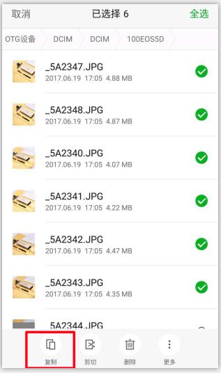 进入SD卡存储又名OTG设备后,长按需要复制的DCIM文件夹的照片,点击左下角的“复制”;