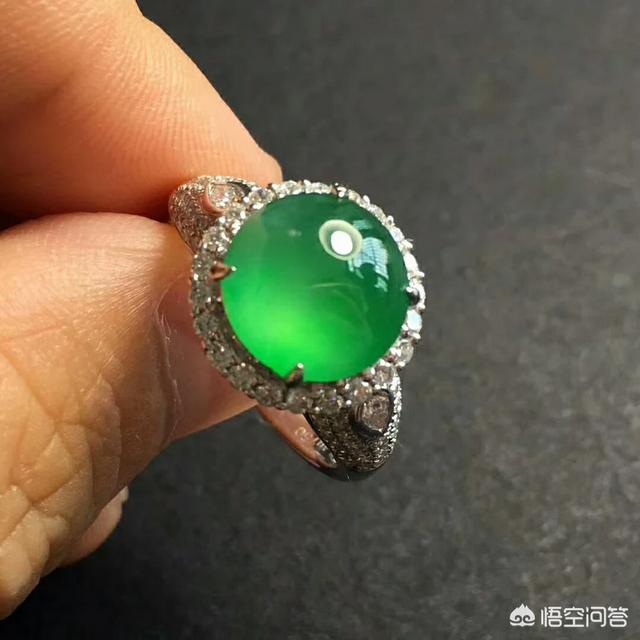 戒面一般都是一块石头上最好的部分取出来的,但也有拿一些边角料做出来的。所以看戒面不看工,多以水和色来定。光有水也行,要仔细看里面有无杂质、棉,若无杂质无棉,有荧光,最少像一滴胶水一样。接下来就看色,说起色,喜欢什么色的都有,就看爱好了。总之,有水有色,又爆满,它就是可收藏的好东西