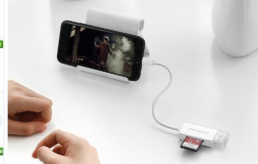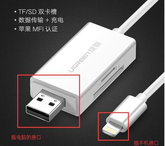 在这里,我就简单介绍一下我知道的苹果插内存卡(包括TF/SD卡)的办法,这个办法是借助苹果手机专用读卡器,比如我再用的这款读卡器,是两用读卡器,因为读卡器两边分别设计了能插电脑接口的USB口,一端则设计了能支架插苹果手机的lighting接口。所以苹果手机想用安卓手机内存卡,直接将读卡器插在手机上,然后内存卡插在读卡器上就可以了。