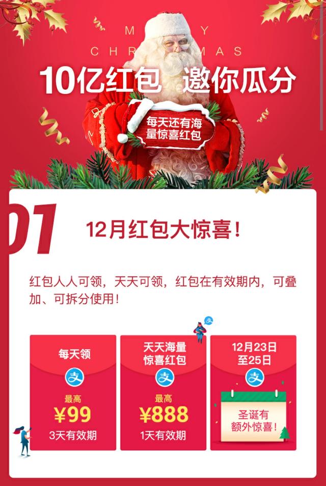 支付宝活动从9月份开始,先后砸二十亿,当然这个数目有待考证,不管怎么说,在最近的双十二圣诞节和周五周六中,红包都是比较大的。开展到现在已经有三个多月了,可以说已经达到或者说基本达到了支付宝想要的效果。