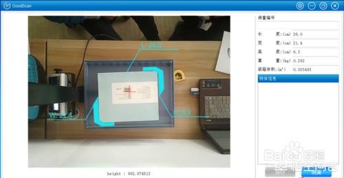 将待测物体放在仪器的测量区域,仪器会自动识别物体,同时测量出物体的尺寸、重量、条码等信息,待灯光或者声音提示后,就完成了一次测量,就可放入下一个物体进行测量。测量结果会显示在屏幕上面,左边显示的是物体的图片,右边显示的是长宽高、体积、重量、条码等信息。