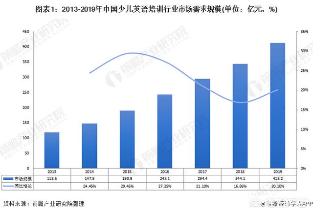 少儿语言培训中,英语是重要的培训内容。据前瞻估算,目前中国少儿英语培训市场规模已达百亿元的量级,并且以每年15-30%的速度扩张。前瞻根据行业增长速度和发展趋势测算,2019年,中国少儿英语培训行业总体市场需求规模(包含线上线下)达到413.2亿元,同比增长20.1%。