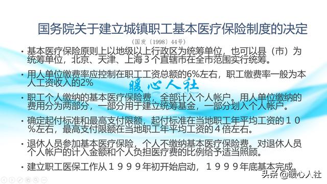 我国职工医疗保险制度,和职工养老保险制度的建立一样,经历了一个从试点到全面建立的过程。全面建立城镇职工医疗保险的时间应该是从1999年1月1日开始,到1999年底全面建成。1998年12月14日,国务院印发了《国务院关于建立城镇职工基本医疗保险制度的决定》,即国发(1998)44号文件。国务院这个决定的出台,标志着我国城镇职工基本医疗保险制度正式建立。根据该文件精神,第一次明确了退休人员参加基本医疗保险,个人不缴纳医疗保险费用,对个人账户的计入金额和个人负担医疗费的金额给予适当照顾,这就是我国医保退休制度的起源。