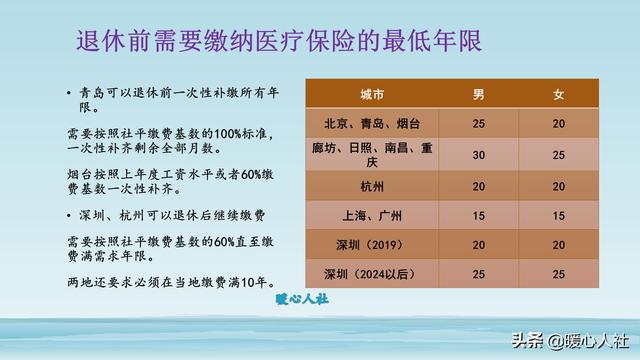 广州和上海市医疗保险缴费的退休年限只有15年,杭州市是20年,深圳市2019年也是20年,不过未来将逐步延长到25年。