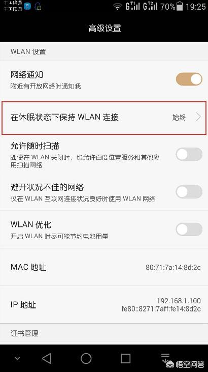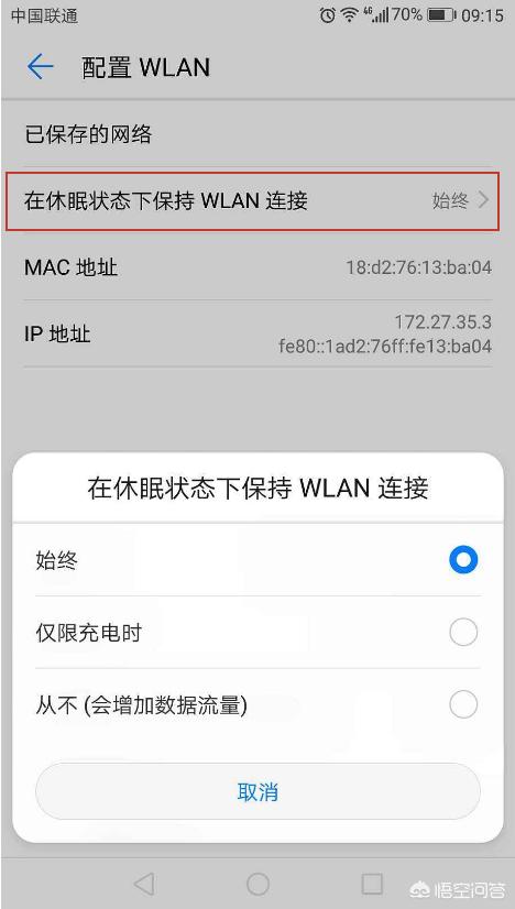2. 手机 “在休眠状态下始终保持WLAN连接”的设置选项错误。