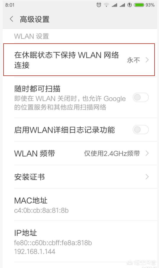 第二种可能,打开手机WLAN设置-高级设置—“在休眠状态下始终保持WLAN连接”,点开选项,“始终”“仅充电时”“永不”,这里选择“始终”。 这是手机为了省电而做的优化策略,如果手机之前设置过省电模式,可能会开启后两个选项,导致手机息屏休眠时WLAN连接断开,自然接收不到任何消息。点亮屏幕或者解锁之后手机自动连接WIFI,于是就能接收消息了。
