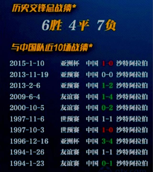 历史上两队共交锋17次,国足6胜4平7负,两队几乎平分秋色。近10场交锋中,国足2胜3平5负,表面上看国足明显不占上风。但是,2015年1月10日亚洲杯--中国1:0沙特,这是两队最近的一场比赛。换句话说:两队的历史交锋中,中国队取得了两队交锋史上最后一场的胜利,并保持6年9个月。