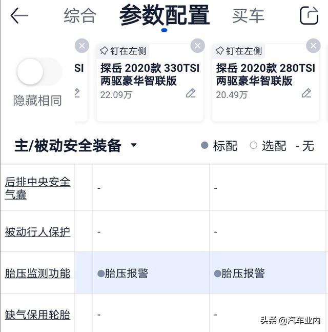 如图,探岳全系标配胎压监测,但不同的配置配备的功能有所区别,豪华智联Pro版本的配的是胎压显示,而智联版本配的是胎压报警。