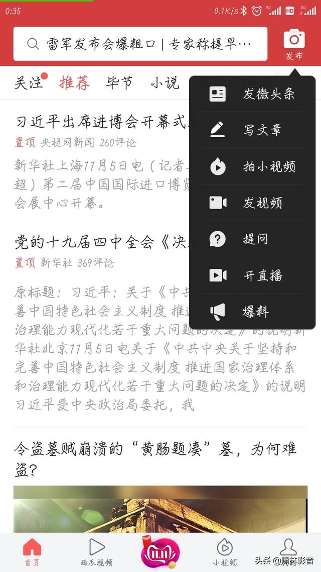 首先下载今日头条APP,然后打开今日头条首页,点击右上角发布按钮,你会发现有拍小视频(自带相机)和发视频选项,点击即可上传拍摄小视频啦!安照提示操作就可以啦!