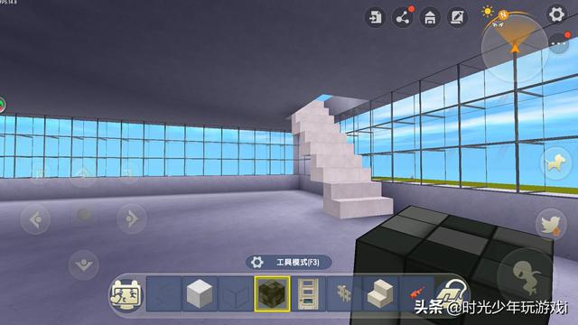 图六:往框架里加玻璃块,在楼梯旁放玻璃片。