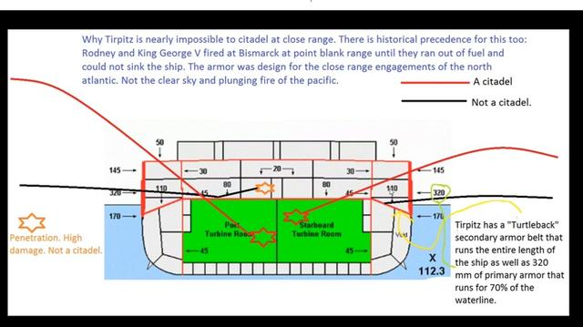 但是这种装甲布置,炮弹击穿主装后,虽然打不穿核心区,但是炮弹会在舰体内部爆炸,也就成了游戏里半伤区的伤害。