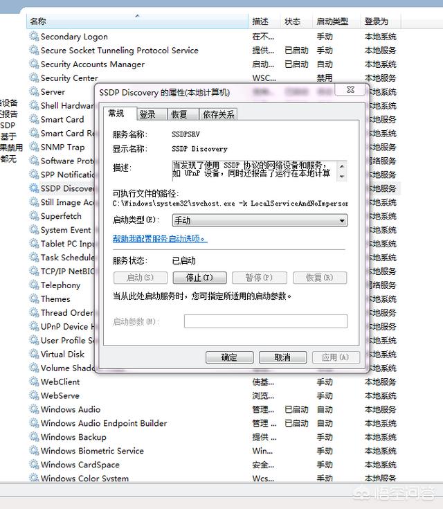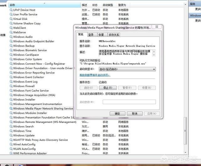 2.找到SSDP Discovery服务和Windows Media Player Network Sharing Service服务,在启动类型中选择手动,单击右下角应用按钮,单击启动按钮,单击确定完成。如果不开启这两项服务,我们就无法打开电脑流媒体选项。
