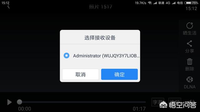 3.点击屏幕右下角DLNA,会出现一个对话框,要选择要接收的对象。选择你的电脑的名称确定连接。