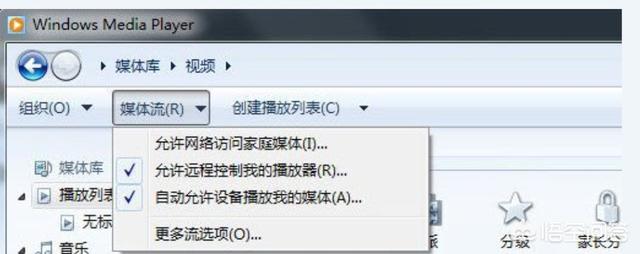 1.首先在电脑上启动Windows7系统的Windows Media Player,“媒体流”,先启用媒体流,选择“允许远程控制我的播放器”、“自动允许设备播放我的媒体”(出现提示时,选择允许),Windows Media Player不要关闭。如下图所示