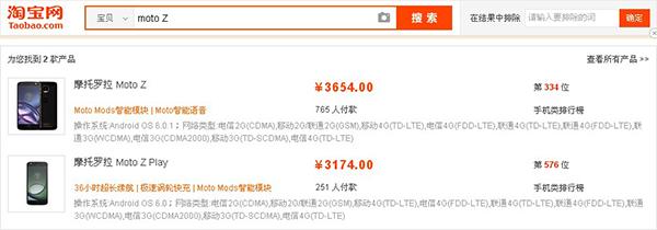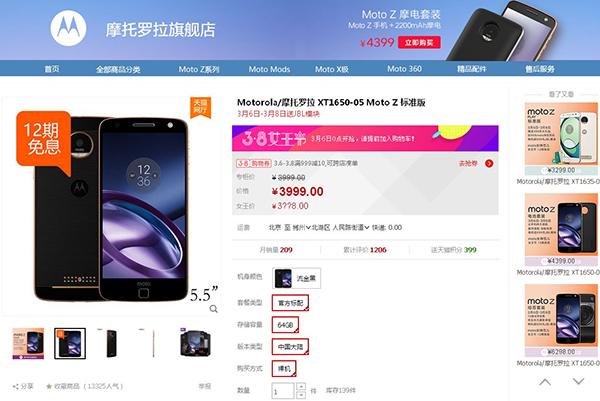 我们进入到淘宝搜索引擎发现,Moto Z的标价还是相当稳定的,月度销量765人付款,处于手机类排行榜单的第334位。进入官网的详情页,发现月销量为209台,累计评价1206台,说实话这样的销量确实不太理想,抱着再试试京东平台的想法,我们还上其他电商平台调研了一番销量数据。