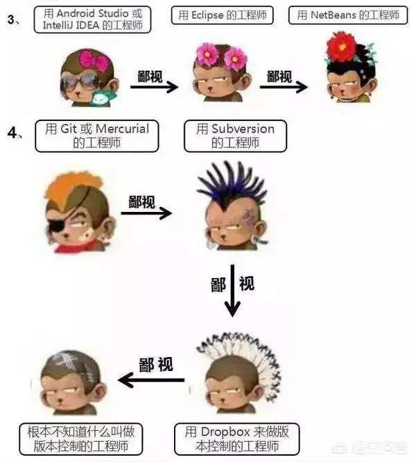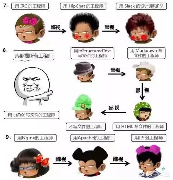 语言上:c与c++相互鄙视,c++与java相互鄙视,java与C#相互鄙视,然后依次鄙视各种语言,近年来python可能出现乱鄙视的现象!